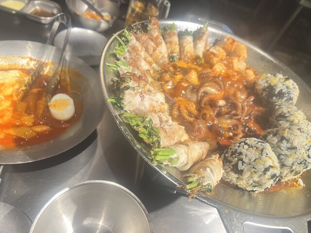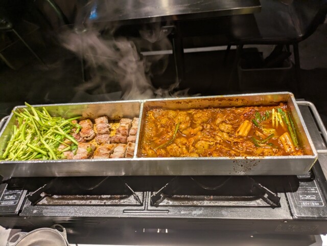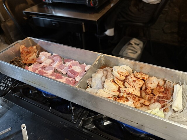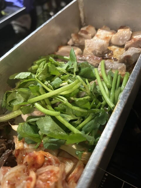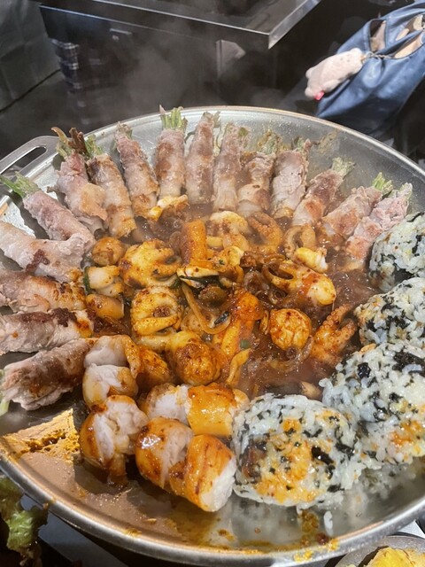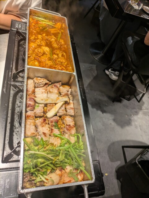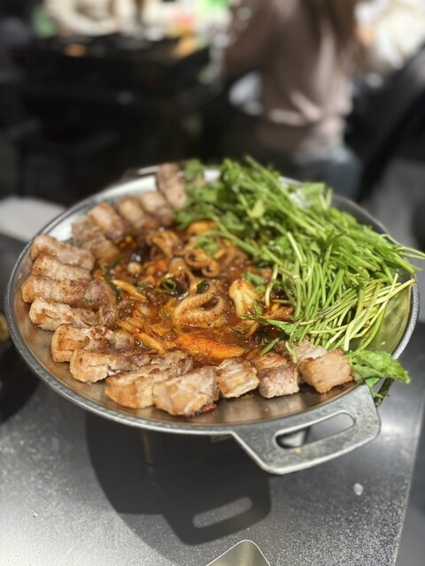 いっぺんに色々味わえる欲張りメニュー。ミナリサムギョプサルとチュクミにナッコプセ、チュモッパまでのセットを食べました。(娘に注文...