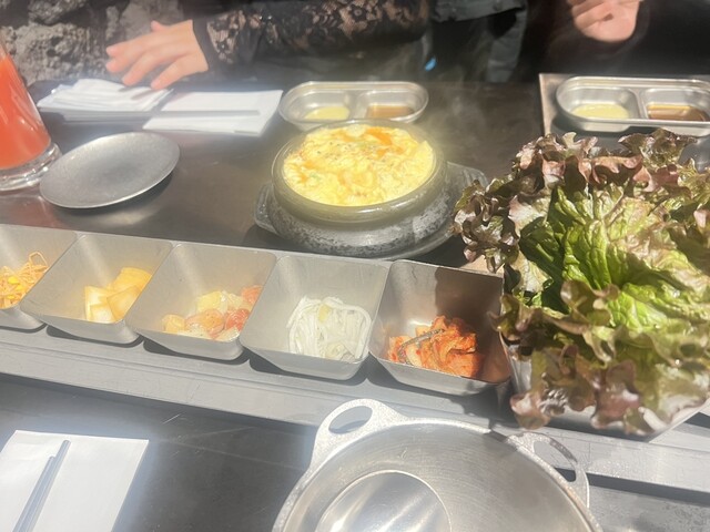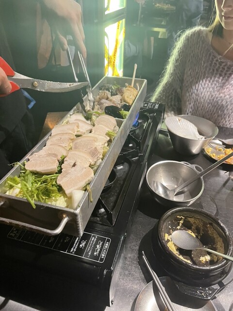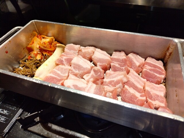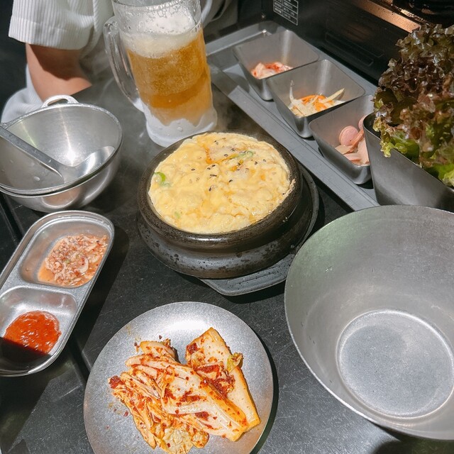 お店の入り口は少しわかりにくくて、最初は通り過ぎてしまいましたが(笑)、入ってみると洞窟をイメージしたユニークな空間!各テーブルには長めのガスコンロが設置されていて、専用のお鍋でぐつぐつと本場スタイルの韓国料理を楽しめます。