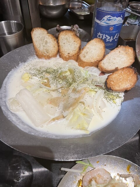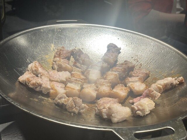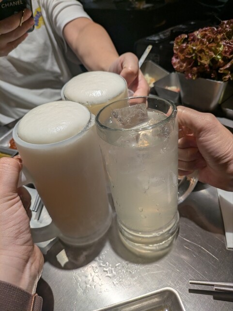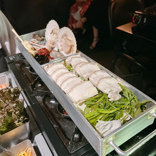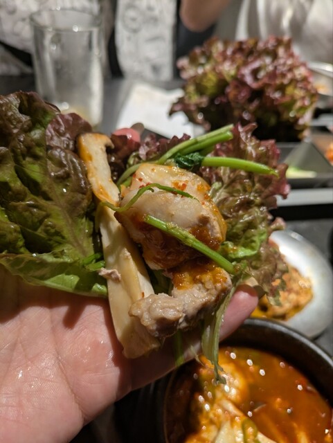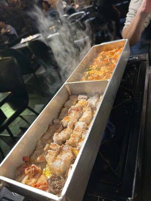 今回は、流行りの「ミナリサムギョプサル」とこの店自慢の「沢山の海鮮が入った蒸し鍋」の2種類をセレクトして、海鮮チヂミを3人で追加オーダーしたけど、〆のカルグクスまでお腹いっぱいです。