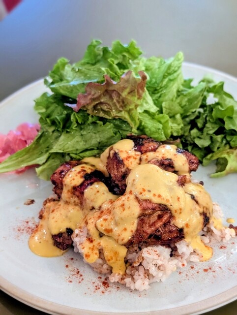 まず見た目からテンション爆上がり!彩り豊かなレタス、トマト、チーズに、たっぷりのひき肉がご飯を覆い尽くしている。スプ...
