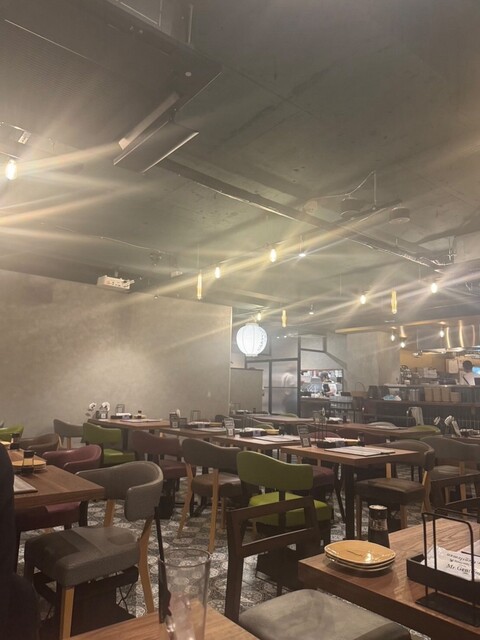 店内はすでに大人気で激混み。テーブル同士の距離感がゆったりめで、賑わいの中でも落ち着いて過ごせる広々とした空間が印象的でした。照明も心地よく、まさに“ネオジャパンダイニング”という名前がぴったりの雰囲気。