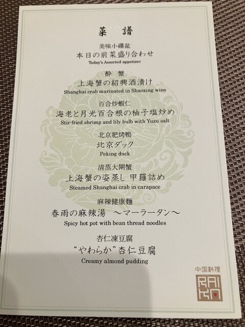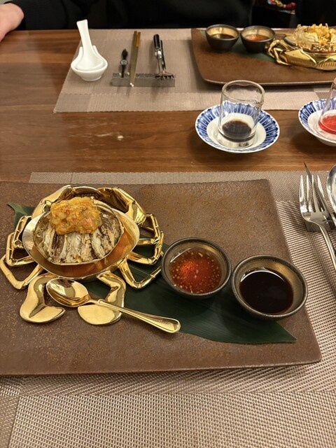 いただく料理の上海蟹を見せていただき、コース料理をいただきました。蟹の味が非常に濃厚で大変美味しかった...