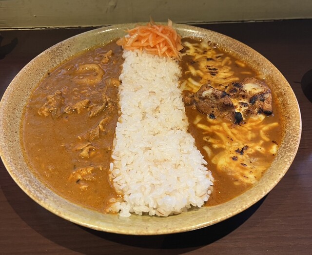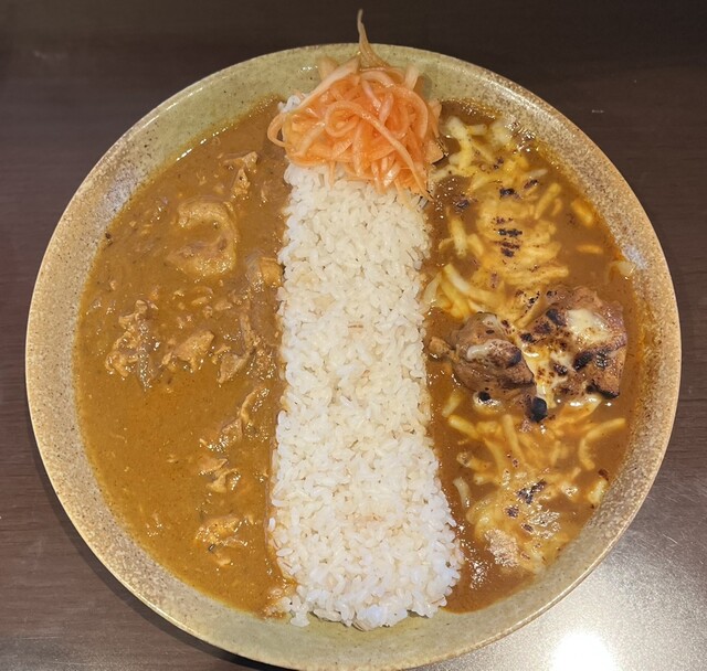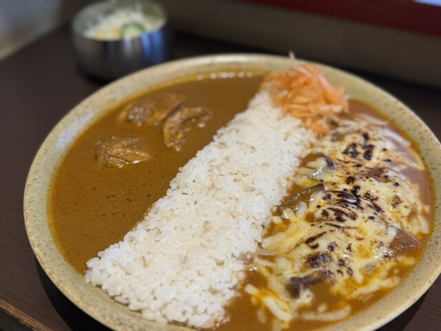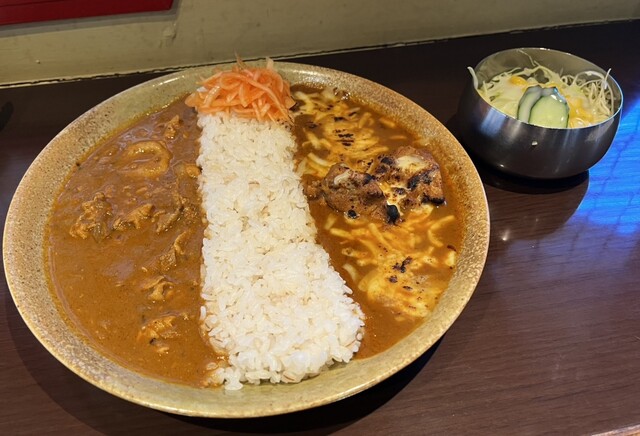 満を持して頼んだのはA+Bのダブルセットで限定のほうれん草のチキンカレーとビーフカレー、炙りチーズトッピング。更に待つこと15分ほどで着皿です。