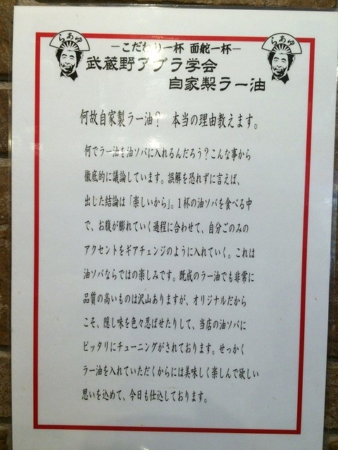 早稲田で創業した武蔵野アブラ學会。武蔵野地方の正当油そばの流れを組む当店は、何と油そばとしては世界唯一のモンドセレクション金賞ww 一体ベルギーの審査員に何が響いたのか?!彼らは油そばを知ってるのか?!など疑問符が頭の中に沢山浮かびますけど、まあ取ってしまったのだからしょうがない。使いますよ。金賞ですよ。現在一号店の早稲田店は建物も倒壊しそうだし、暑いし、学生並び過ぎだしで、一般の方々には近寄りが...たい店になっていることも事実。そこで、この代々木店。居ぬきといえば居ぬきですけど、そこそこお金も使い、快適空間。本当に同じ学会なのかというほど。何と前のお店のオーナーは○千万円をこの店の内装に使ったそうですよ。そんな高級設備で食す油そば。未知なる体験です。この油そばは、一度食べたら最後。35回位は通うことになります。20回の来店で世界のVIP垂涎のゴールドカード発行。学会はこのカードで覚醒します