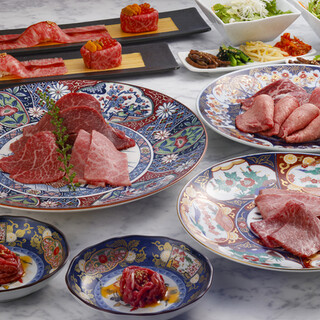 ■サラダ ■キムチ・ナムルの盛り合わせ ■和牛炙りユッケ風 ■上タン塩 ■上ハラミ ■上カルビ ■和牛三点盛 (ヒレ、上赤身、ざぶとん) ■肉寿司2種盛り合わせ ■本日の神戸牛特選二種 ■デザート |