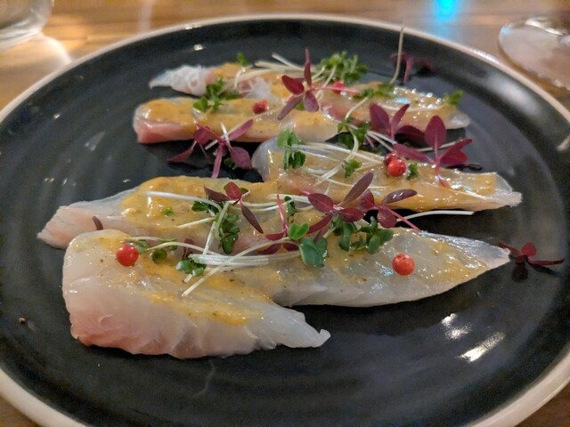 千駄ヶ谷エリアも線状降水帯に包まれた平日の宵、既に少々きこしめした状態でおひとり様利用。 入り口に販売してるワインにライトを当てて輝かせる反面、カウンター席は極力照明を抑えて仄暗く落ち着いた印象。 ソーヴィニヨンブランをお願いすると、NZのデルタを出していただきました。 しっかりしたボディ... 詳細を見る