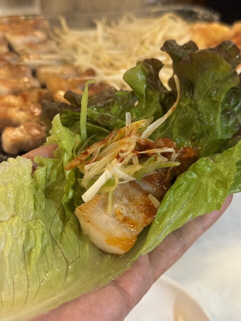 いただいたのは得々ランチセット。メインは厚切りサンギョプサル(お店の表記がンでした)、チーズタッカルビ、テジカルビから選べます。私たちはサンギョプサルにしました。