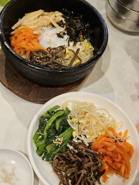 厚切りサムギョプサル、チーズチヂミ、ナムル、石焼ビビンバ、チャプチェ、キムチ盛り合わせ、などをいただきました