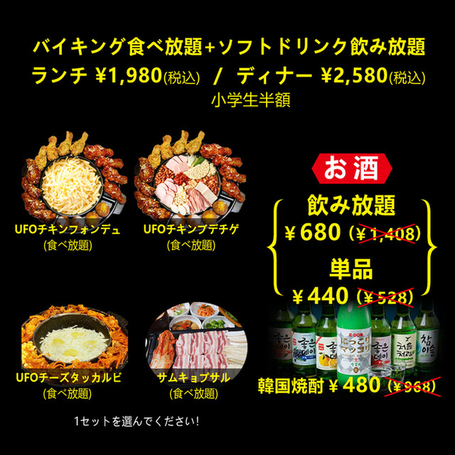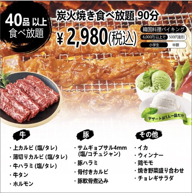 明るくにぎやかな雰囲気の中、サムギョプサルや種類豊富な炭火焼肉をリーズナブルにお楽しみいただけます。健康志向の方にうれしいヘルシーな料理も♪自慢の食べ放題は、好みやご予算に合わせて幅広くお選びいただけるほか、コースに追加できる飲み放題も1,280円とお得です!さらに、小学生以下のお子様は食べ放題が半額ですので、ご家族連れでのお食事にもオススメ◎女子会やデート、各種ご宴会にもぜひご活用ください!