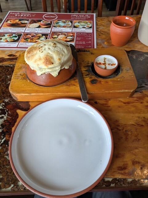 『ラトマト』とは、ネパールの赤士で作った伝統的なお皿の事。当店のお皿は全てネパールから持ってきたラトマトです。