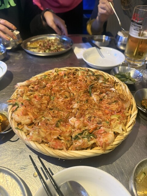 韓国料理ポチャ クァンジャン市場は、韓国の家庭料理が気軽に味わえて、特にチヂミは外カリ中もちでお酒がすすむ美味しさ。雰囲気もにぎやかです。