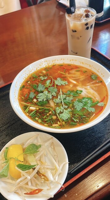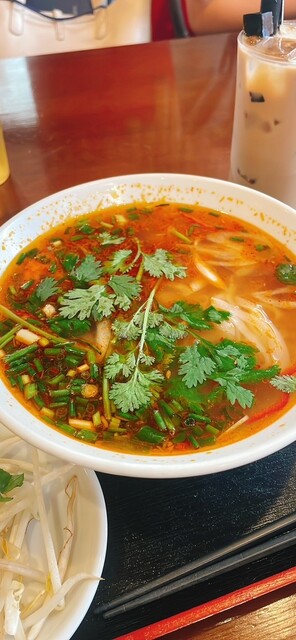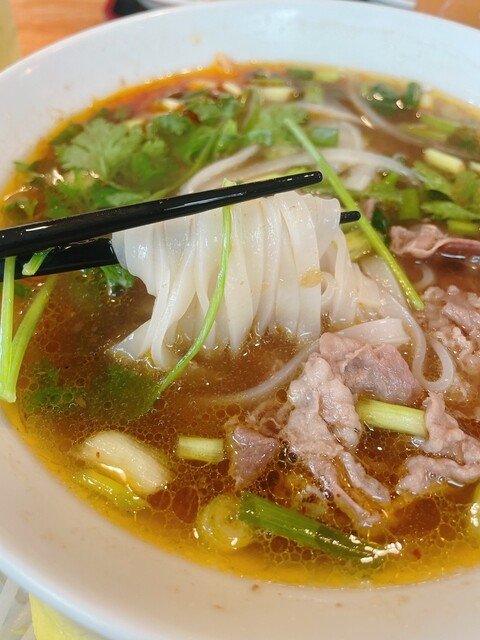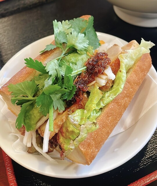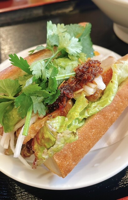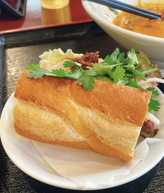 土曜日14時9分、お客さんはそこそこ入ってました。 注文はタブレットから、休日ランチのバインミーフォーセット1150円で、フォーは牛肉のすり身団子、バインミーは揚げ豚肉、ベト... 詳細を見る