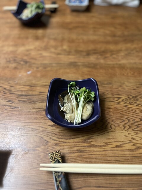 お通しは茄子、お刺身盛り合わせとか牡蠣とか色々食べた!