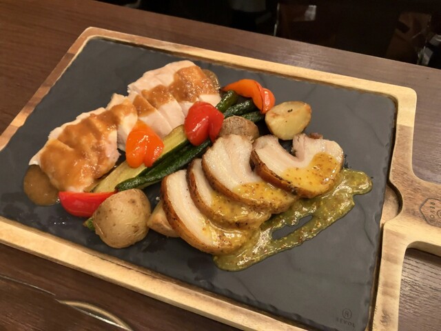 利用したのは、「【Wメイン】三元豚・大山鶏の盛合わせやアクアパッツァなど全7皿+時間帯無制限飲み放題(月~木・日限定) (¥4800)」。