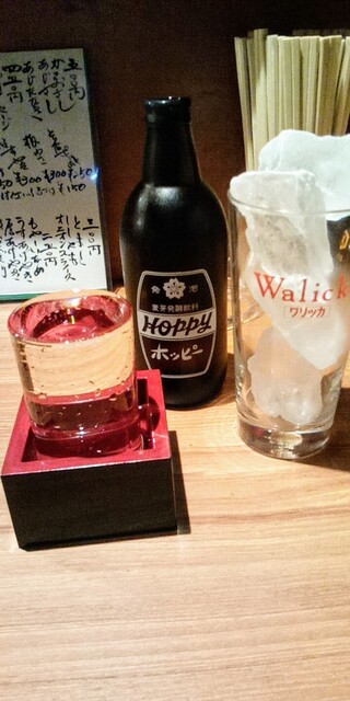 ホッピーは、ナカ焼酎が冷酒のごとく枡に入って出てきます。