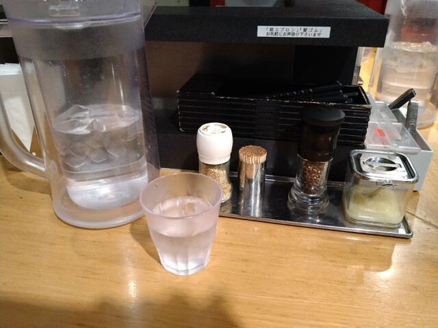 カウンターにはすりおろしにんにく、ゴマ、紅生姜、辛子高菜などがあ...