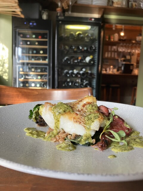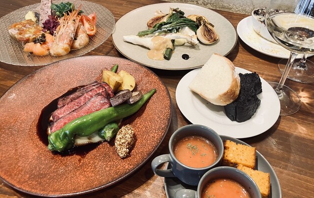開放的な店内で楽しむ料理とワイン。 かすみ鴨や旬の食材をその日の仕立てでご用意しております。