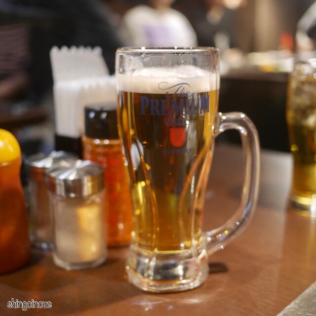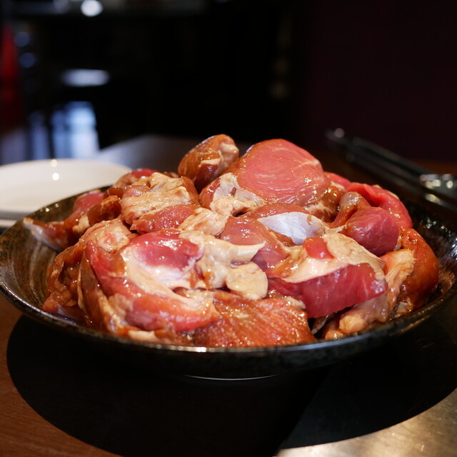 初めてなのでコースはやめて単品で頼もうと、とりあえず“青島ビール”を注文して飲みながらタブレット表示のメニューを見てみます。目当ては羊の焼肉なのですが高い…前足¥5,280、後足は¥6,280、売り切れだったけど背中の肉は¥4,280…説明を聞くとコースの肉よりだいぶボリュームがあるサイズとの事。他にもちょこちょこ注文して食べたいの...