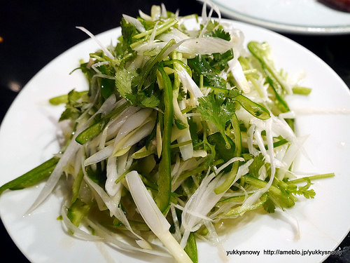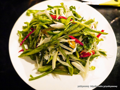 パクチーに青唐辛子、ピーマン、ねぎのヴィネガー風味のラオフーサイ。