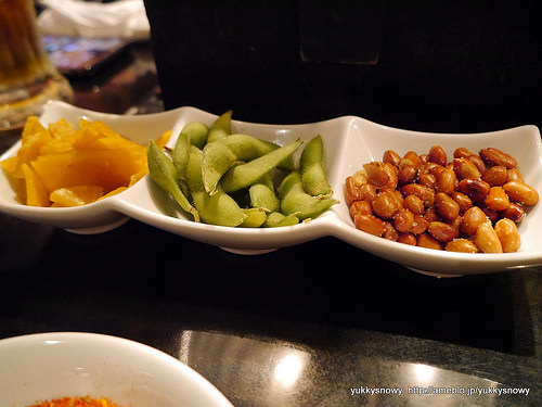 大根の壺漬け風、枝豆に塩をまぶしたピーナッツがお通し。
