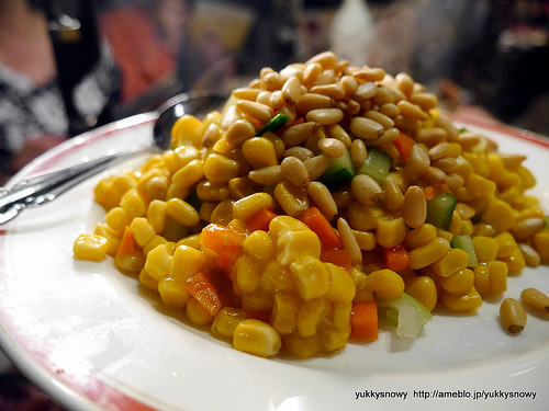 松の実とコーンの炒めものは、たっぷりの松の実がトッピングされていたのですが、お皿が回ってきた時にはコーンだけになっていました、涙
