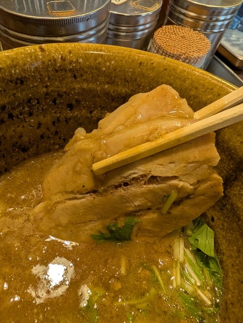 麺は胚芽入りでもちもちとした食感。噛むたびに香ばしさが広がり、ドロッとしたスープによく絡みます。チャーシューは厚みがありながらもほろほろと柔らかく、脂...