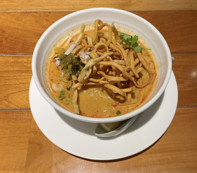 チェンマイポークカレーはいつも通りとても美味しかったです。甘辛いスープ、ゴロゴロ入った豚の角煮、ピーナッツ、赤玉ねぎ?(甘酸っぱい)、千切り生姜が合わさった独特の風味がやみつきにな... 詳細を見る