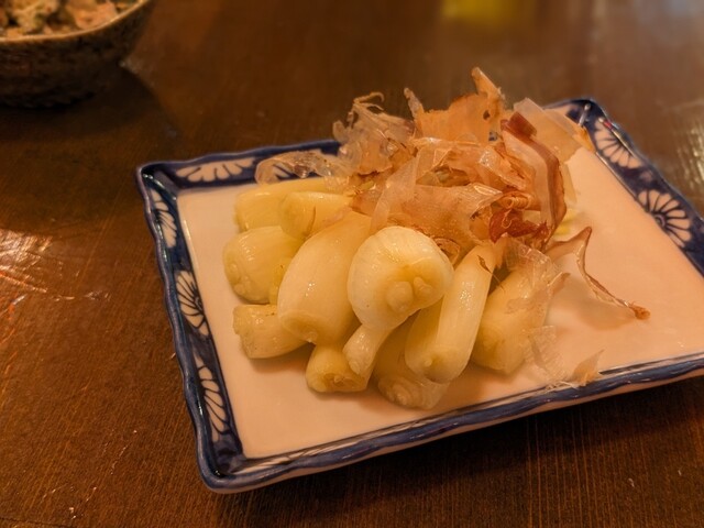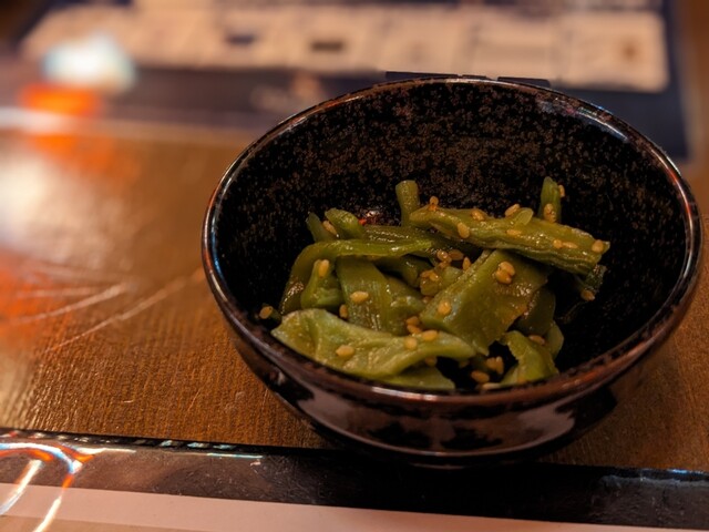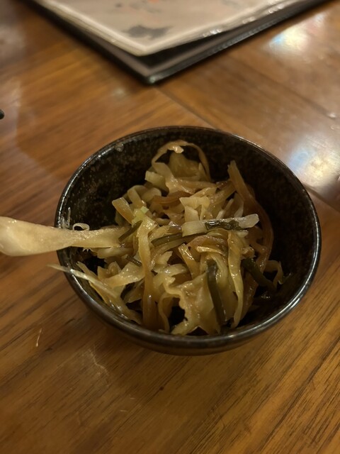 お通しはキャベツの昆布和えのような創作小鉢。最初のアテとしては好きなタイプでした。