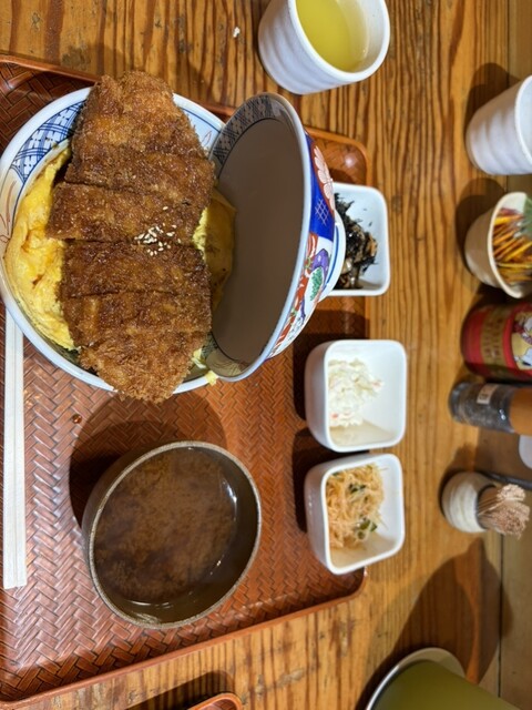 卵焼きの上に乗ってるカツが魅力的なソースかつ丼を注文。ちなみにサイドで3つ選べる