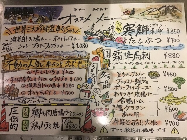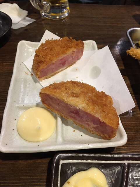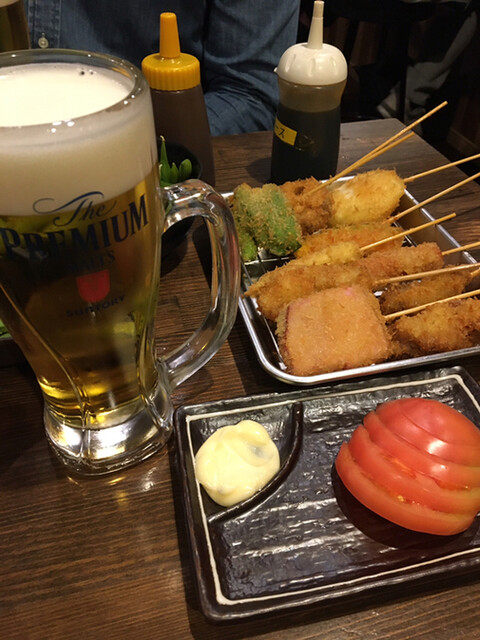 お店は地下1階。戸を開けるといきなり階段で焦った。 串揚げがメインだけど一品料理もある。 串揚げは120~500円。最高峰の500円はホタテキャビア! 野菜類は大体1... 詳細を見る