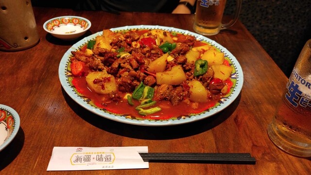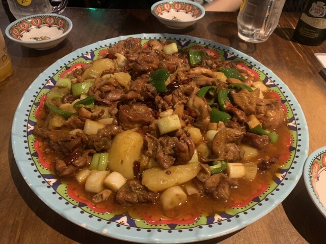 中国系の友人に勧められてやってきた。中国系のお客さんで賑わっている人気店。まずビール、あとは事前に教わってきた「新疆風大皿鶏肉辛口煮込」と「新疆風ラム肉の串焼き」。大皿煮込みは「中... 詳細を見る