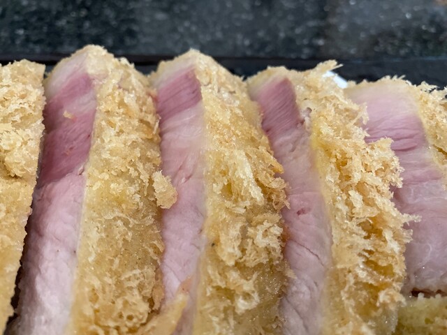 出来上がりですがやはり白いとんかつで断面はピンク色ですがちゃんと火は入っています。