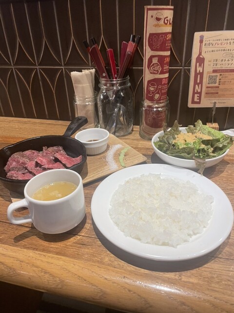 リマインダー 牛ハラミステーキランチをオーダーしました ハラミ肉は150g、サラダ、スープ、ライスにドリンクが付いて1320円です(2025年3月現在) サラダには、人参ガーリックドレッシングがかかっており自家製と思います 糖質を抑えるためにサラダから食しています、幸先よし 熱々のスープに... 詳細を見る