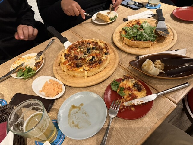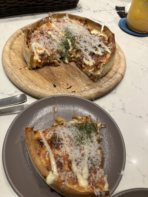 シカゴピザは焼き上がりまで20分かかるので、すぐ注文。中からトロトロ濃厚なチーズ。食べ応えあり、美味しい。