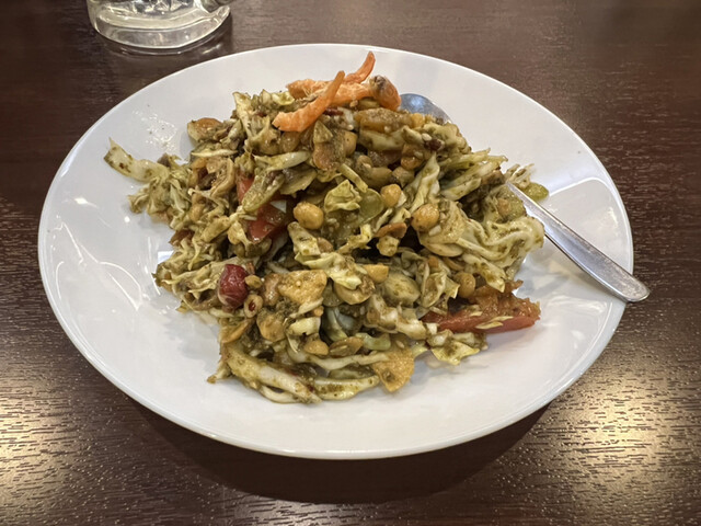 定番のラペットゥ(お茶の葉サラダ)(750円)は食べやすいが酸味があり、少し辛めだ。