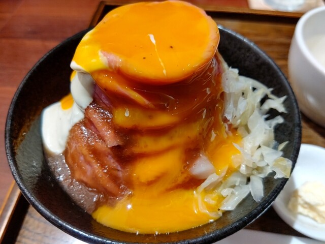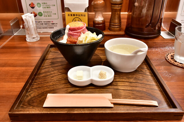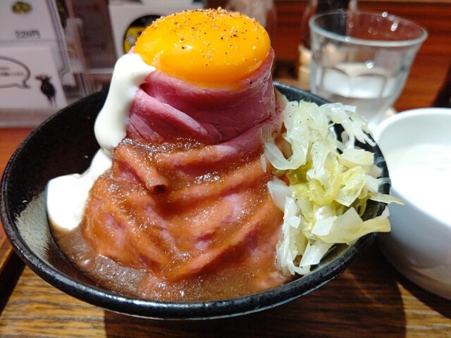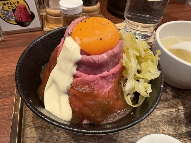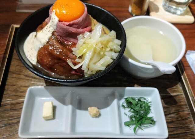 、黒毛和牛ローストビーフ丼定食 肉M、米S、シャリアピンソース。(クリームチーズの味噌漬け、山わさび付) 土曜の昼、どこの飲食店も人が多く行列を成しているのにうんざりしながら、... 詳細を見る