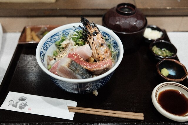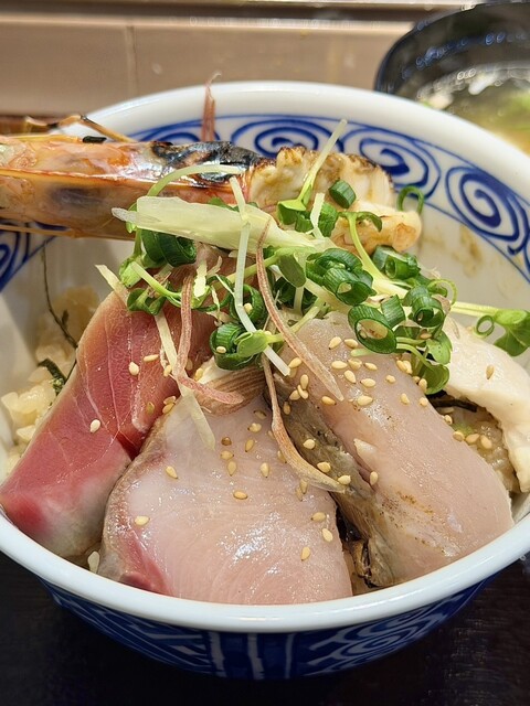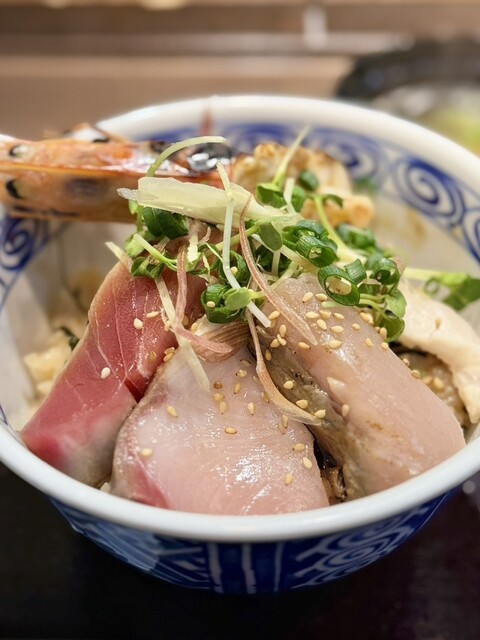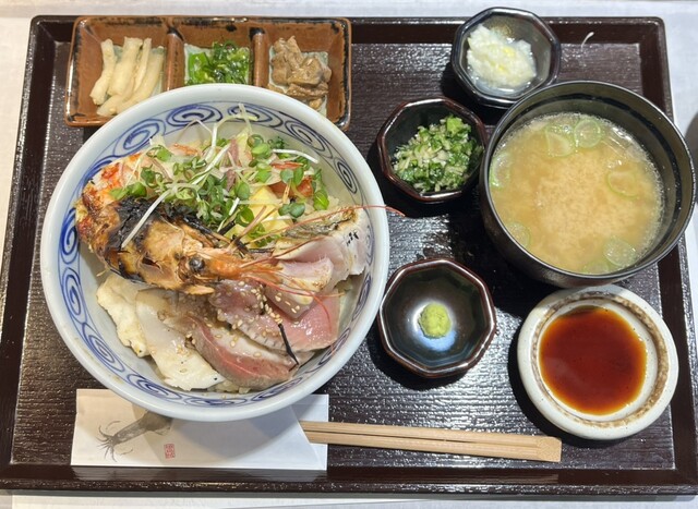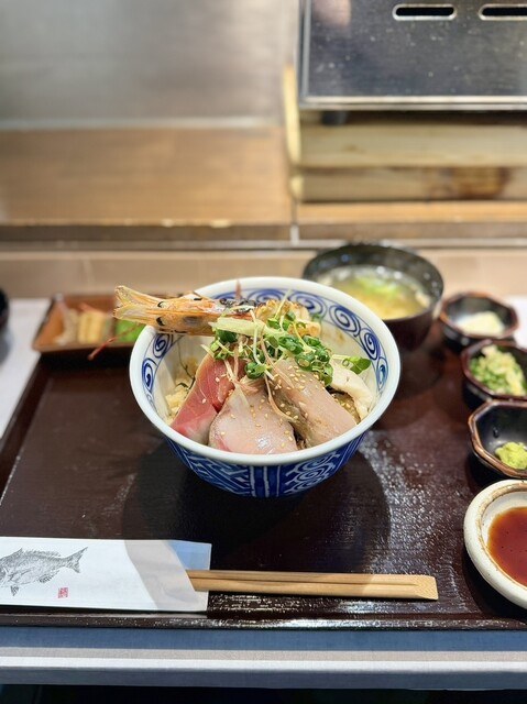 店内はコの字のカウンター席が14席。お昼のメニューはコースか、本鮪やウニイクラ、海老蟹など、魚火焼きという魚を炙った丼などいろいろな海鮮から選ぶ御膳。