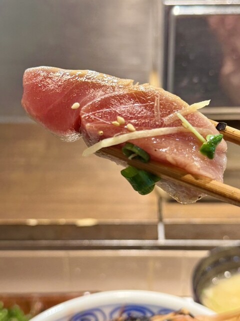 刺身でも召し上がれる魚を鉄板でレアに焼き上げます。