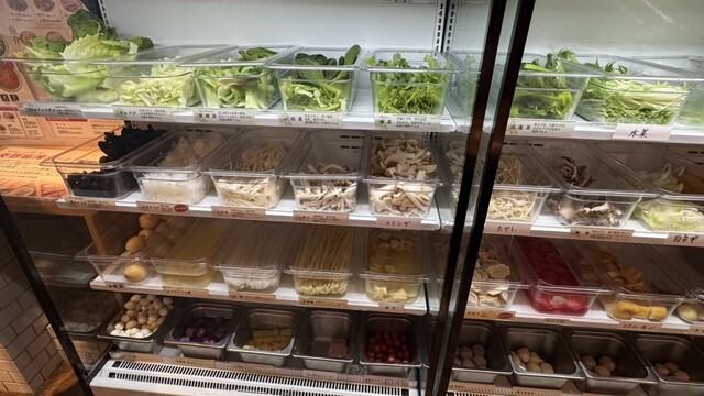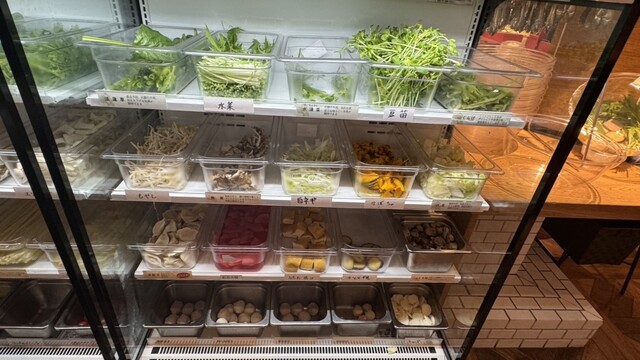 私はお腹そこまで空いてなかったので、控えめにカボチャ、小松菜、しめじ、パクチー、トックを選択し、会計時にスープは薬膳白湯...
