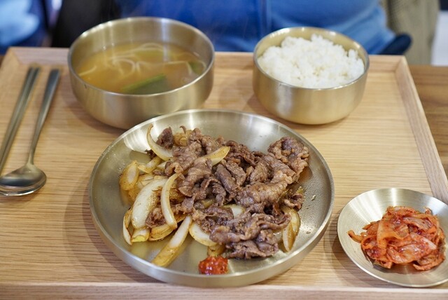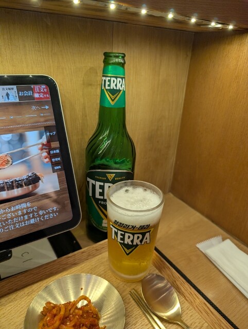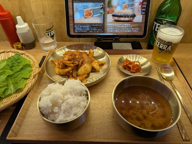 メニューのご案内に従い、一番人気のチェユクポックム定食とテラビールを頼みました。