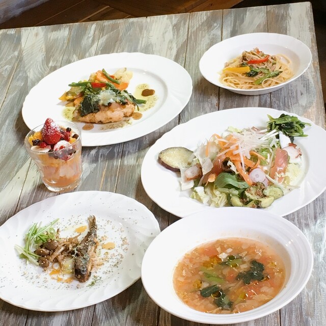 本日のヘルシー前菜盛り合わせ+お魚料理+お肉料理ガッツリサラダ添え+パ...スタ