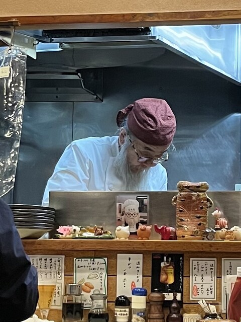 20分ほど待って店内のカウンター席、目の前では仙人髭を生やした店主がかつを上げている。