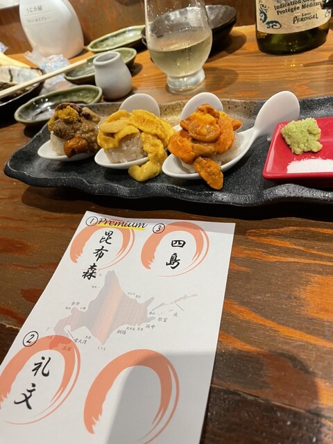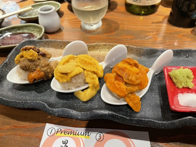 まず注文したのは、店の哲学が凝縮された、うにの刺身盛り合わせです。この日は三種類。見た目こそ似ていますが、一口食べればその違いは歴然でした!利尻産のバフンウニは、舌の上でとろりと溶け、凝縮された甘みが爆発するかのよう。対して、もう一方のム...