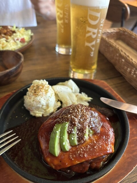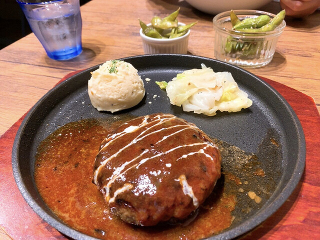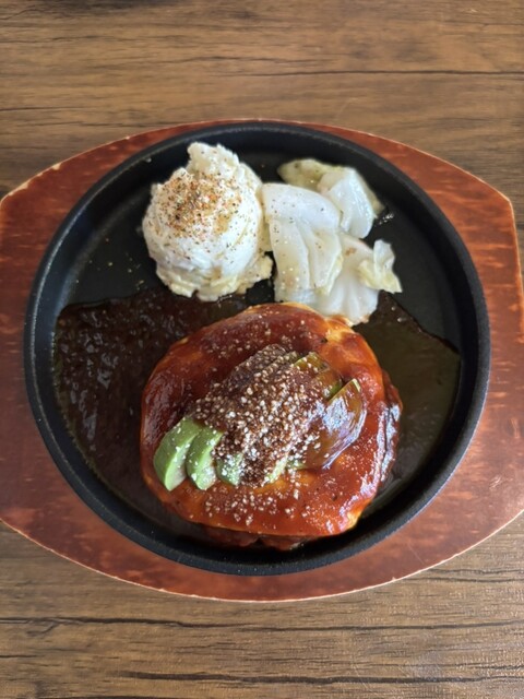 ハンバーグが本格的、肉汁ドブァ~の肉々しい美味さでした。