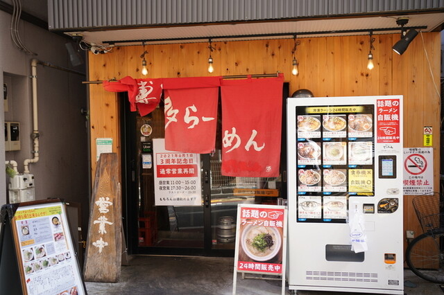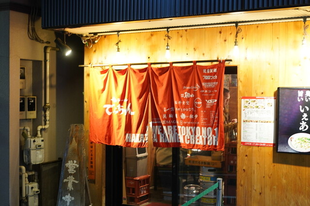 JR高田馬場駅の早稲田口を出て徒歩4分で到着。早稲田通りを進み「伝説のすた丼屋」で左折すると、右手に赤い暖簾と店頭に冷凍ラーメンの自販機があるお店でございます。