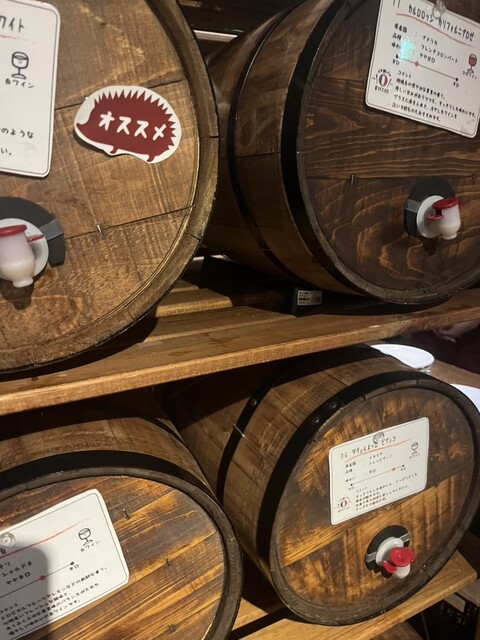 店内に並ぶ16種類の樽ワインは、セルフ飲み放題で楽しめます♪