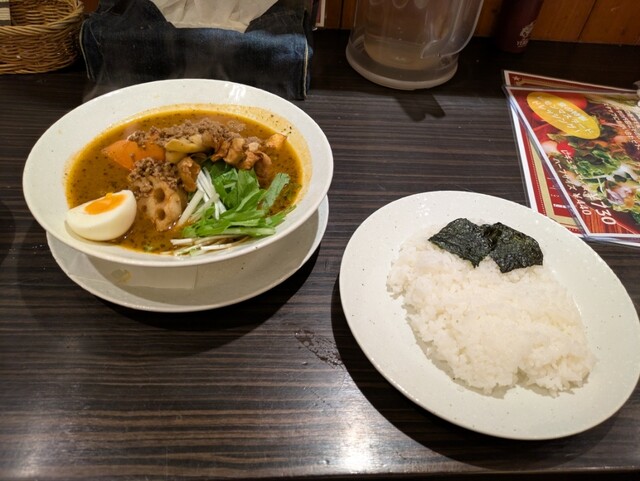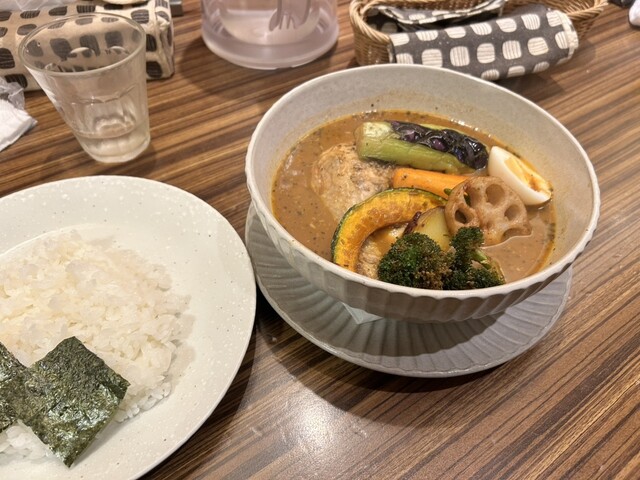 最近スープカレーに嵌っているので、食べログで検索、こちらのお店にも伺いました。 早稲田駅徒歩1分。 カフェのような雰囲気です。 おひとり様カウンター先とテーブル席も充実しています。 ☆シーフードスープカレー 1500円 をオーダー。 具材は、 海老、イカ、タコ、あさり、帆立、ムール貝、岩海苔、人参、ジャガイモ、水菜、ゆで卵 具沢山です。 辛さはレベル0~5までで、中辛の2... 詳細を見る