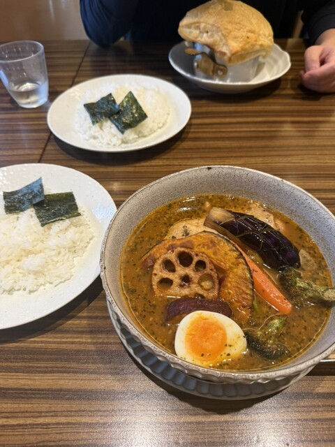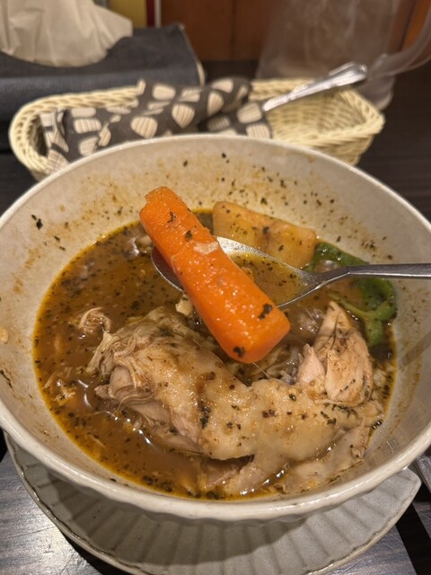 スープカレーで暖を取りたくなり、札幌スープカレーの名店へ。辛さレベル3のスープは自分にとってちょうど良く、ほんのり甘みを感じさせる野菜との相性が抜群。チキンも骨...