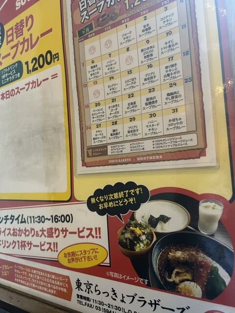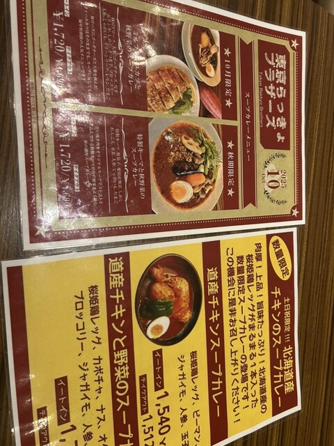 北海道のスープカレーの名店の東京支部、東京らっきょブラザーズに行ってきました。開店25分前に到着して一番乗り。その後少しずつ列ができました。開店10分前にお店の方からメニューを渡され、一覧。もともと豊...