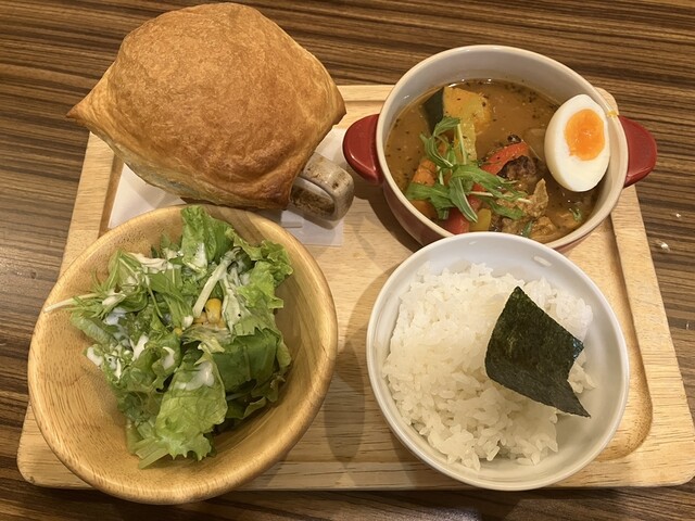 初めて伺いました!迷いに迷った結果パイ包みを捨てられず、チキンスープカレーとマンスリーのパンプキンパイ包みのハーフ&ハーフを5辛でオーダー。